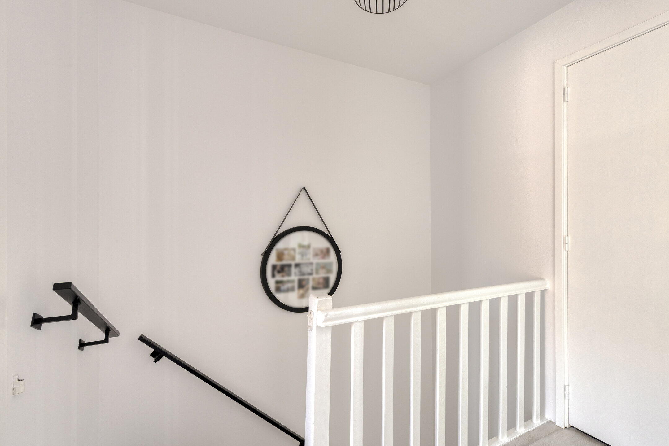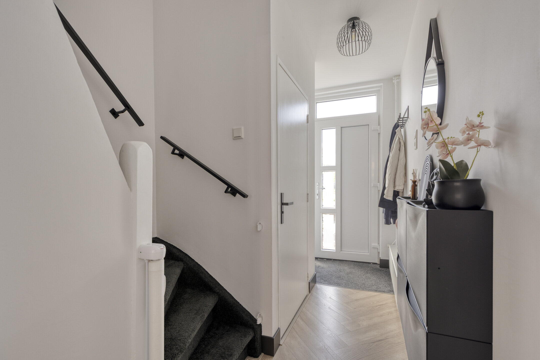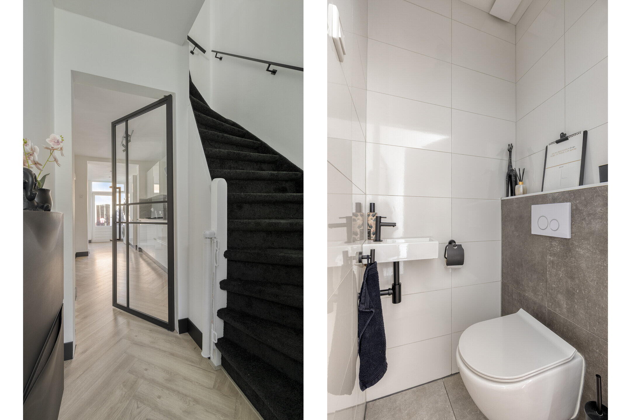 Bij binnenkomst word je direct verwelkomd in een moderne hal met een prachtige visgraatvloer. De hal voelt strak en verzorgd aan en geeft toegang tot een apart toilet en de vaste trap naar boven, voorzien van donkere vloerbedekking. Een entree die meteen de toon zet voor de rest van de woning.