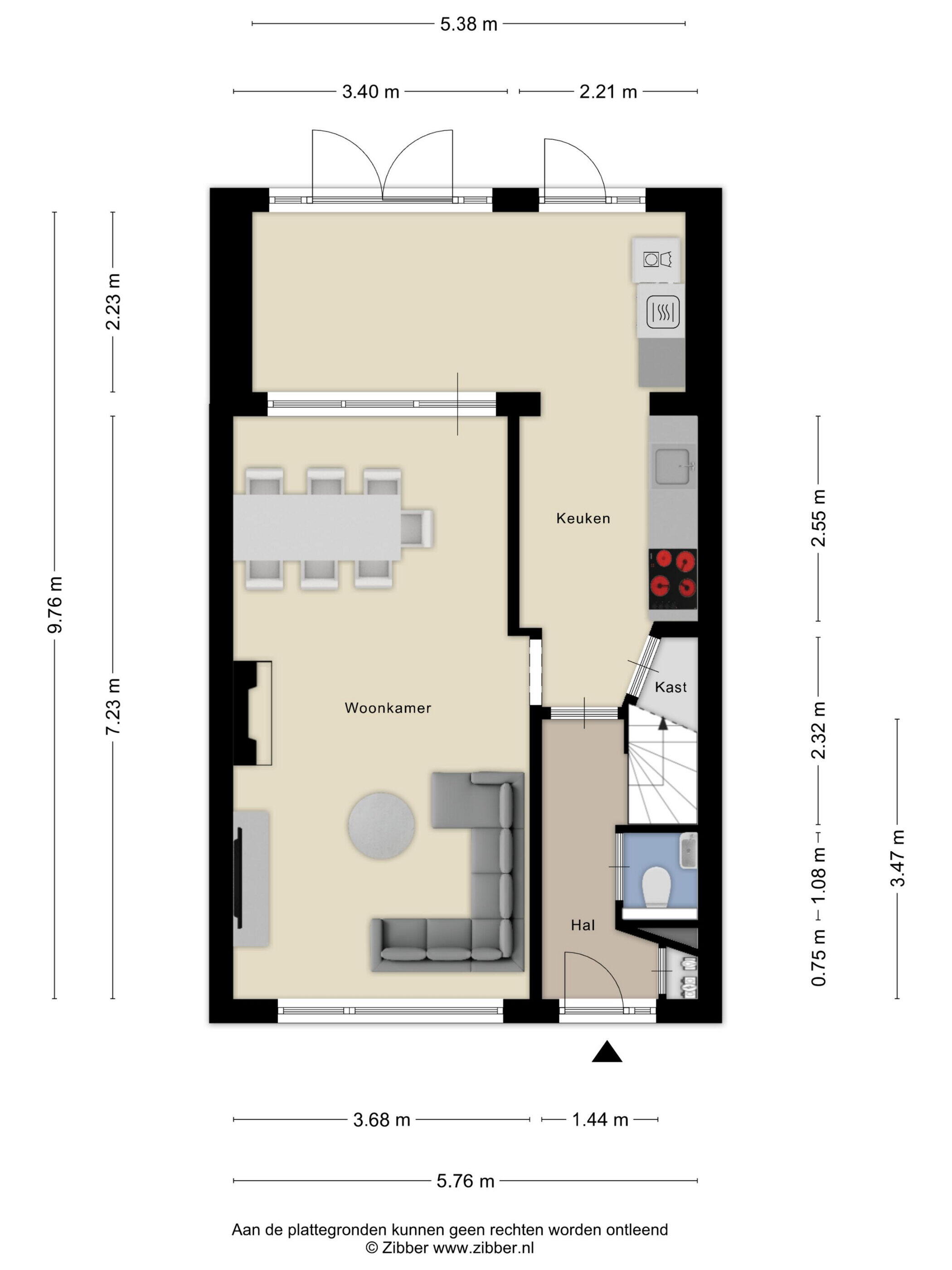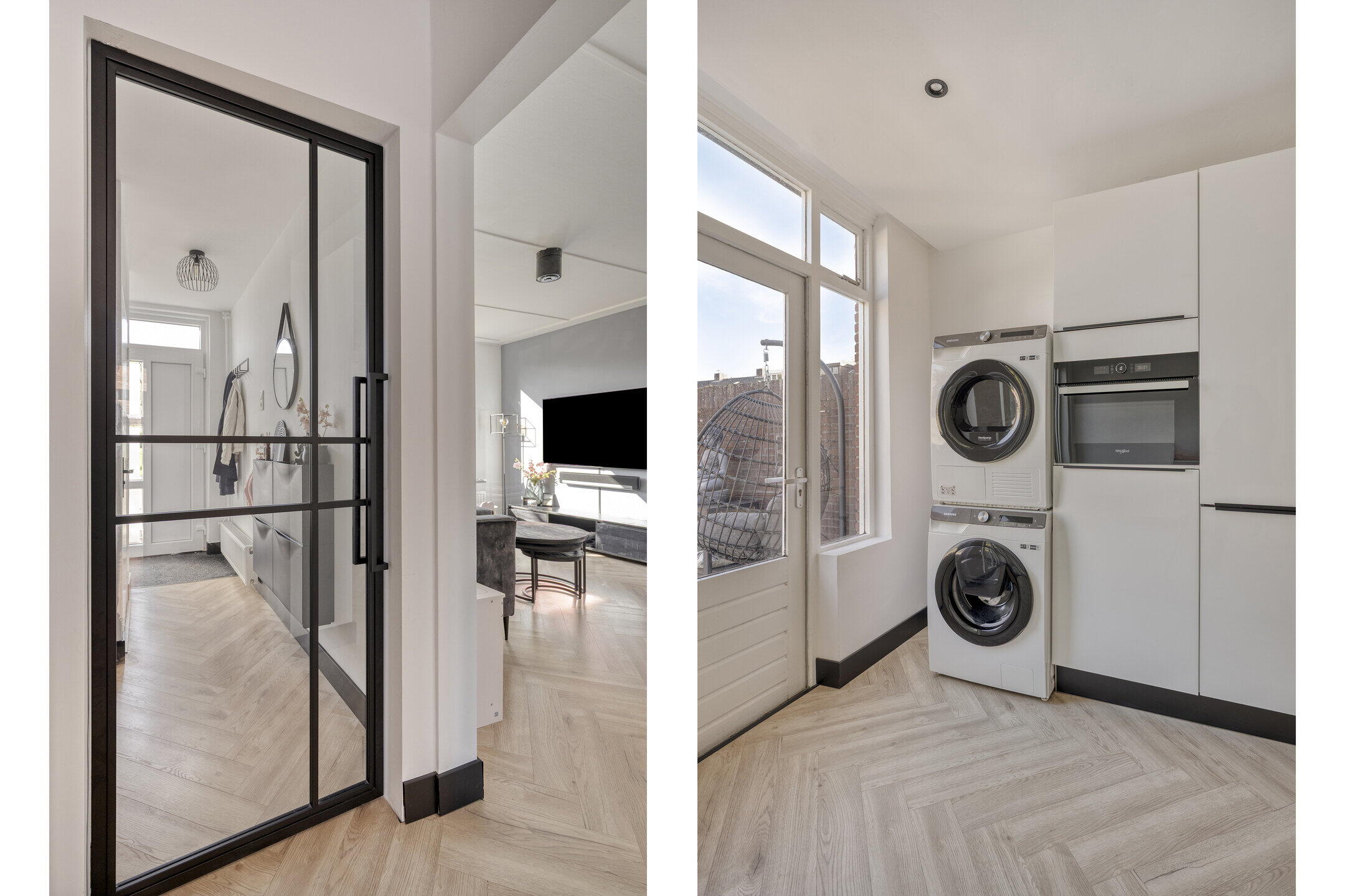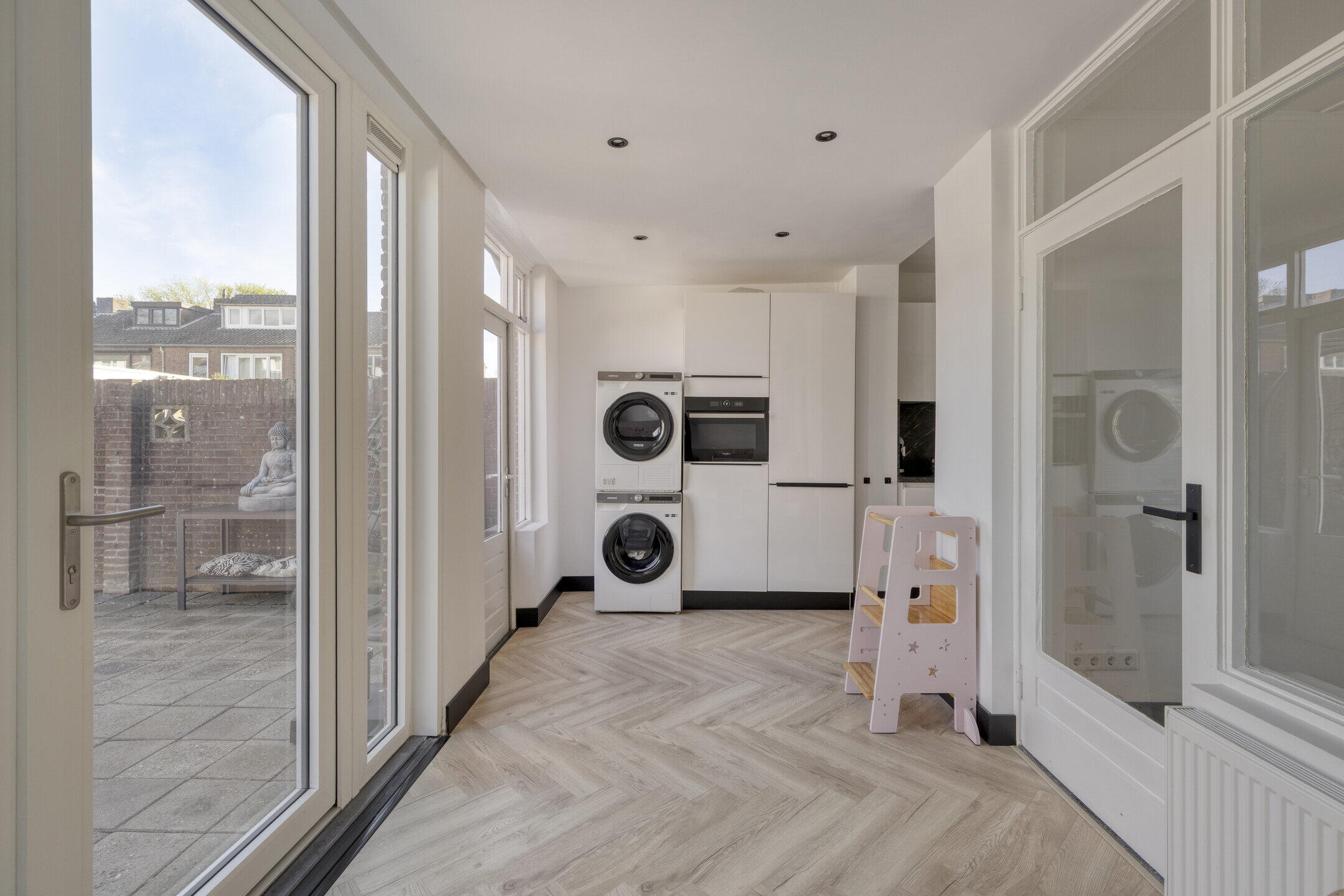 Bij binnenkomst word je direct verwelkomd in een moderne hal met een prachtige visgraatvloer. De hal voelt strak en verzorgd aan en geeft toegang tot een apart toilet en de vaste trap naar boven, voorzien van donkere vloerbedekking. Een entree die meteen de toon zet voor de rest van de woning.