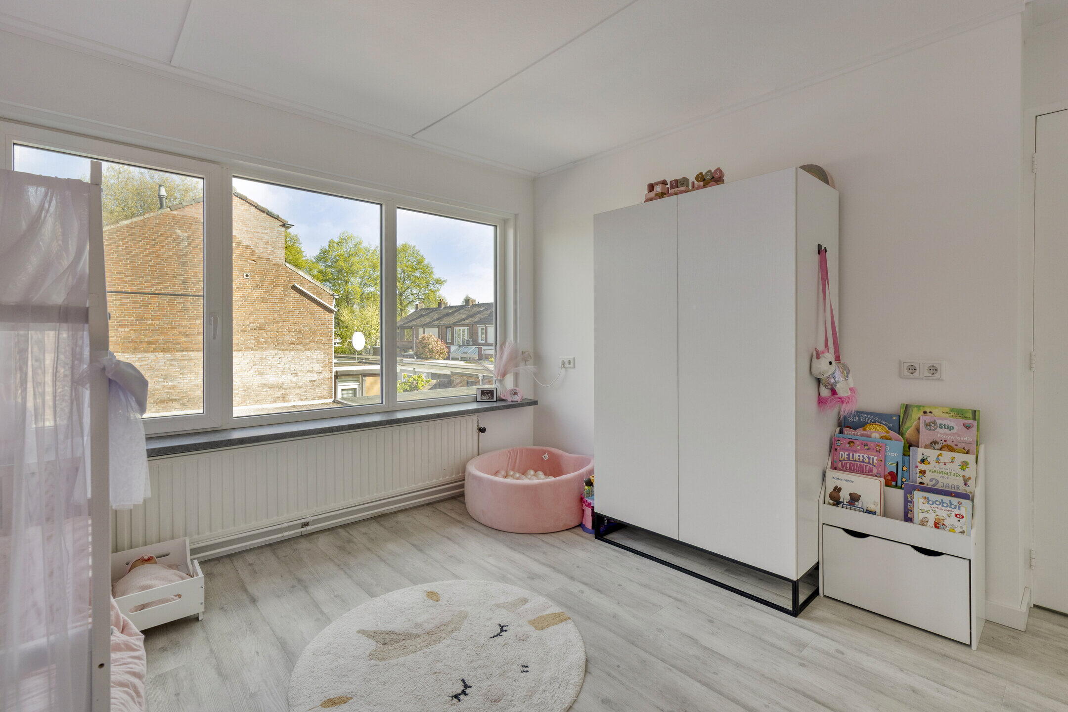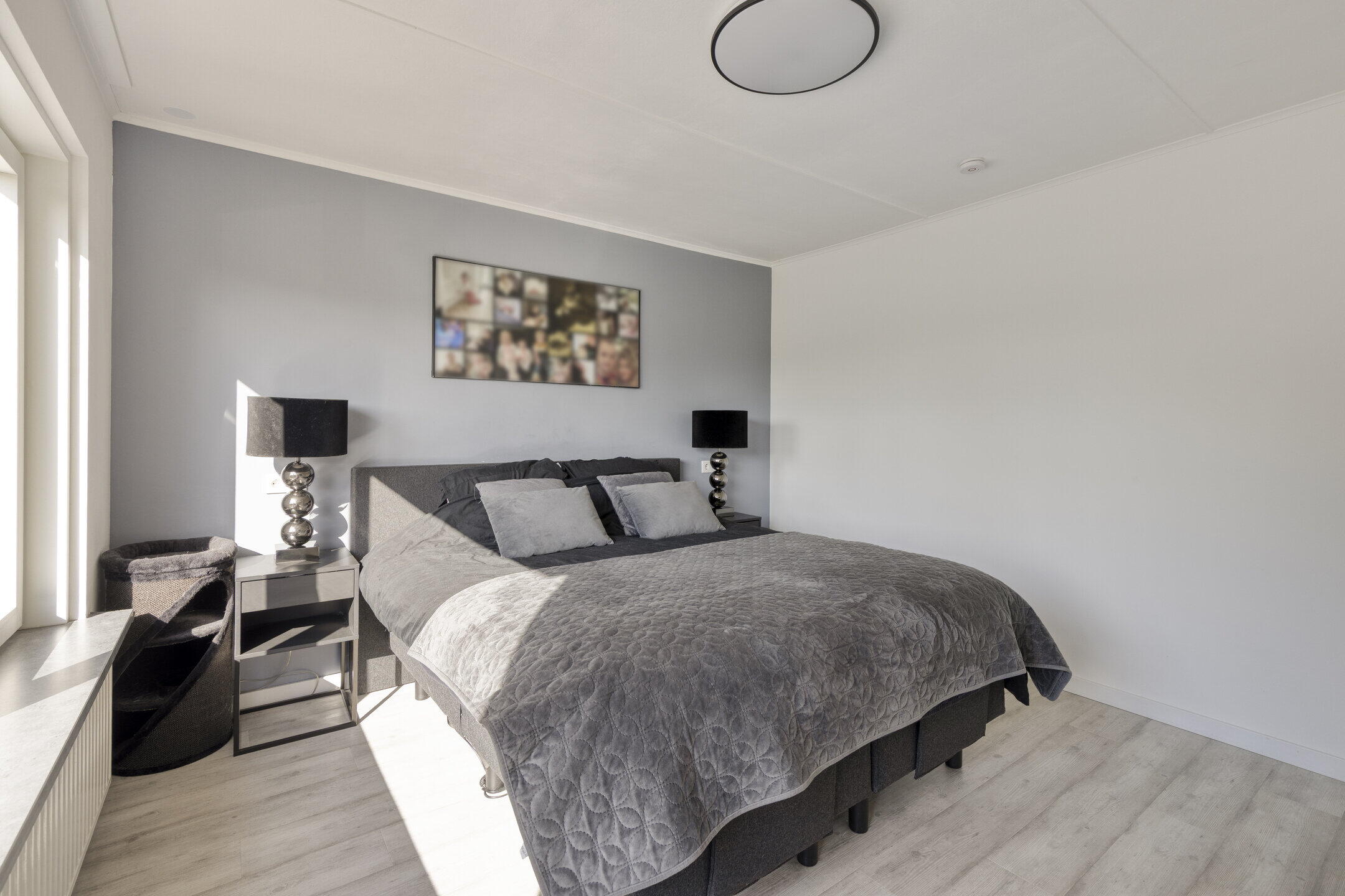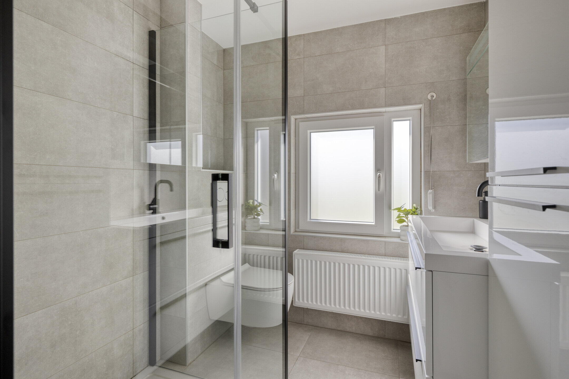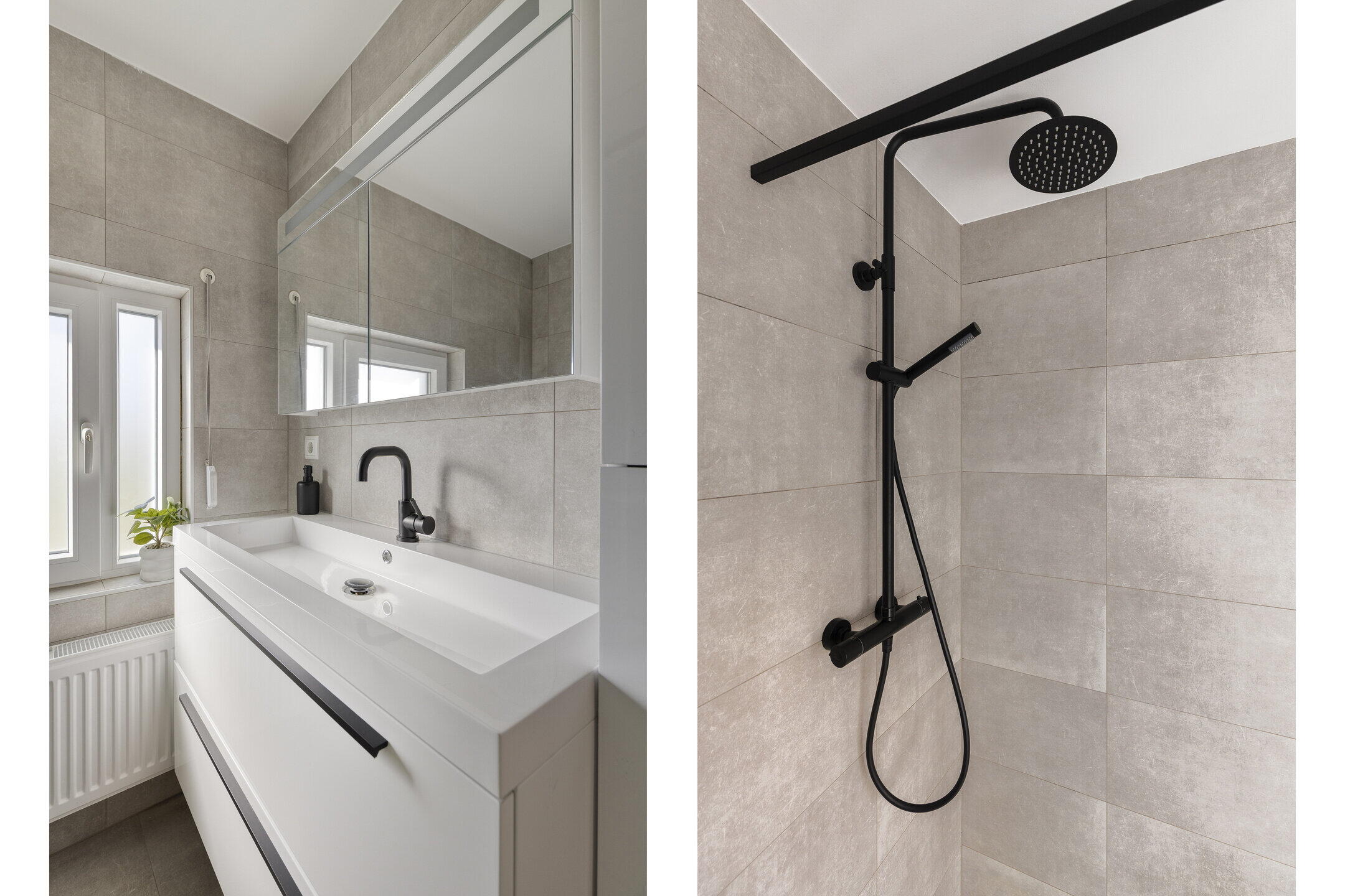 Op de eerste verdieping bevinden zich drie slaapkamers, allemaal netjes afgewerkt en voorzien van veel daglicht. Eén van de kamers is momenteel ingericht als kastenkamer, wat direct laat zien hoeveel mogelijkheden deze woning biedt. De badkamer is modern en luxe uitgevoerd met een ruime inloopdouche, een wastafelmeubel en een tweede toilet. De combinatie van beige/grijze tegels met zwarte accenten geeft de ruimte een stijlvolle en rustgevende uitstraling. Ook beschikt de woning over een zolderverdieping, ideaal voor extra opslag of eventueel verder in te richten naar wens.