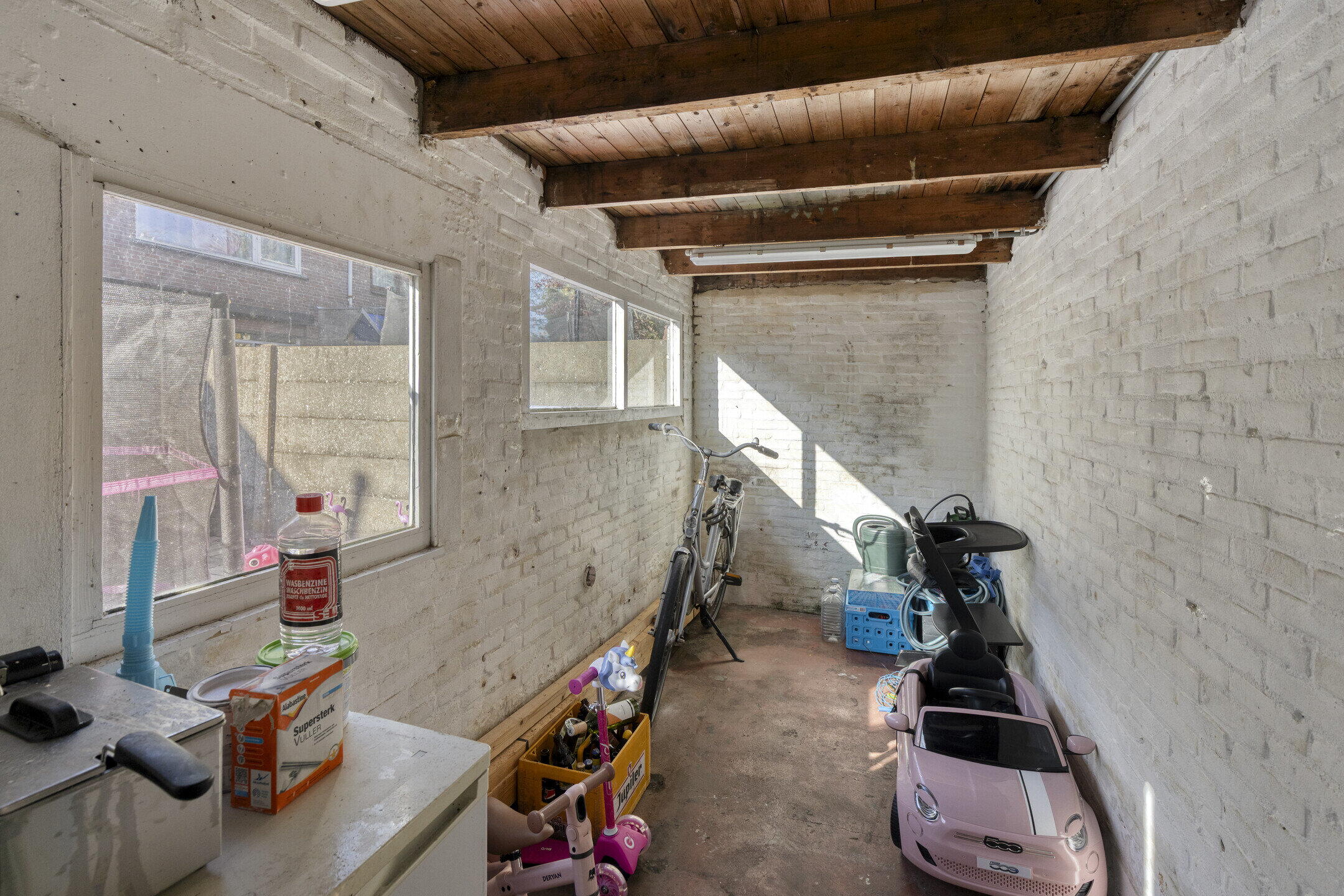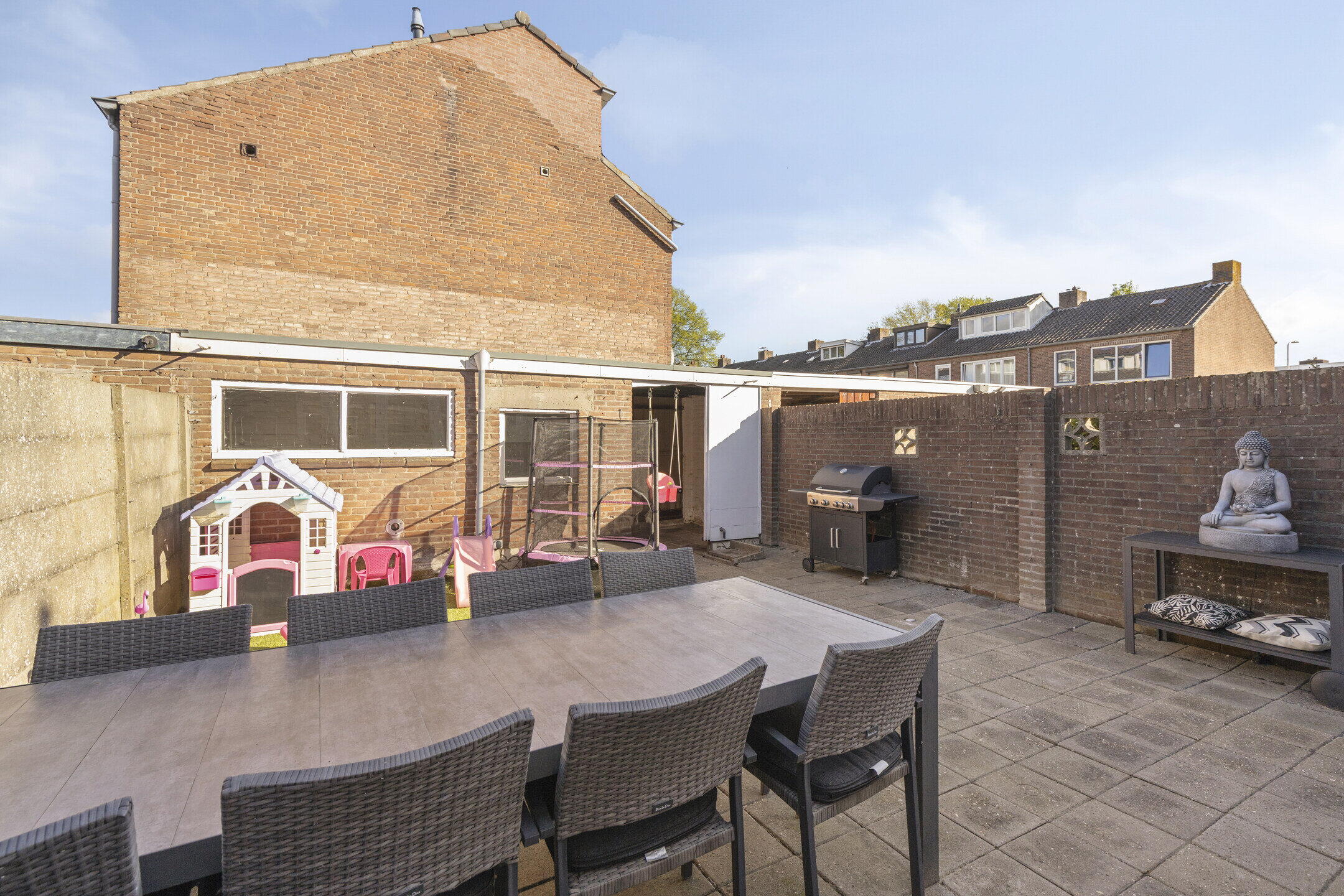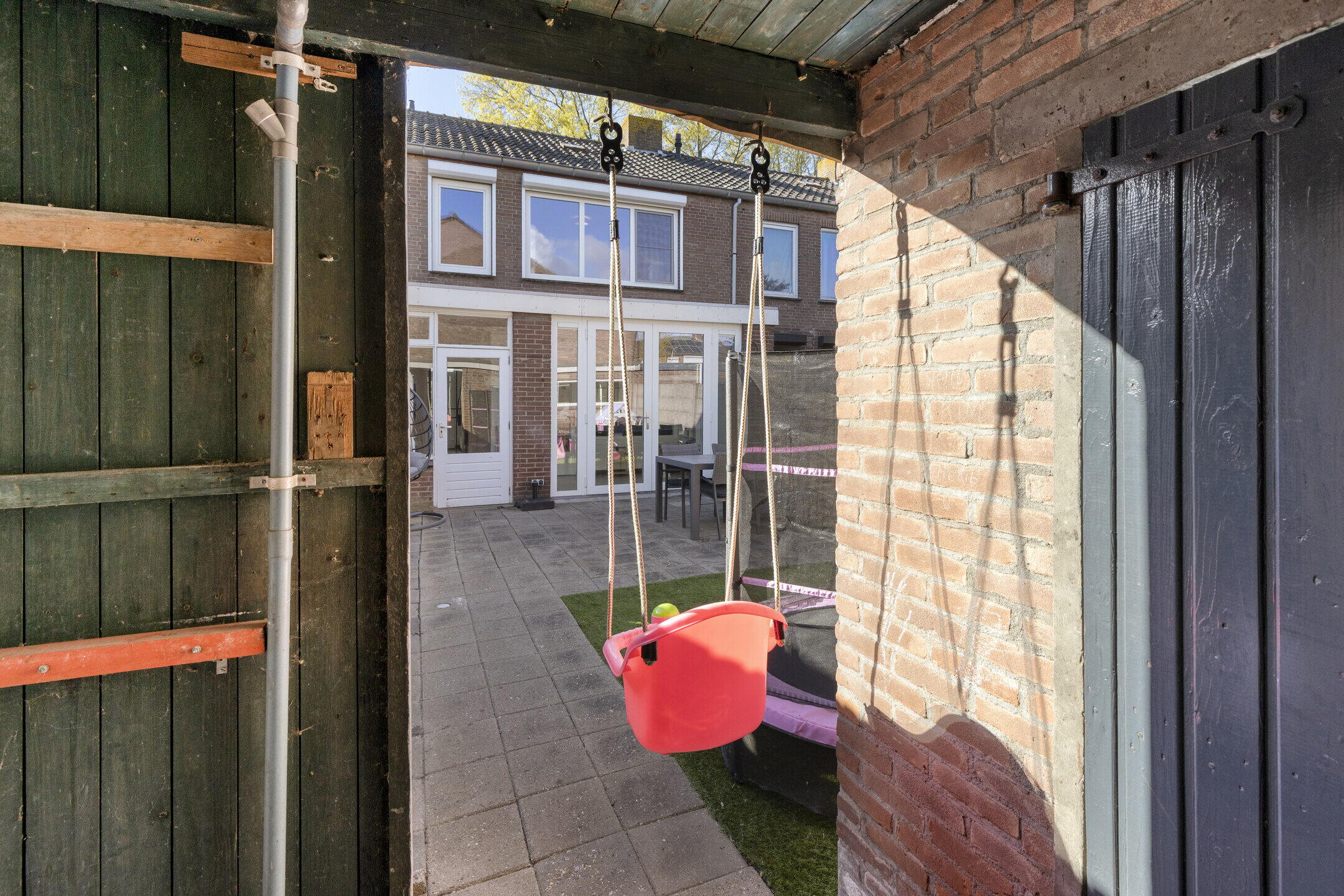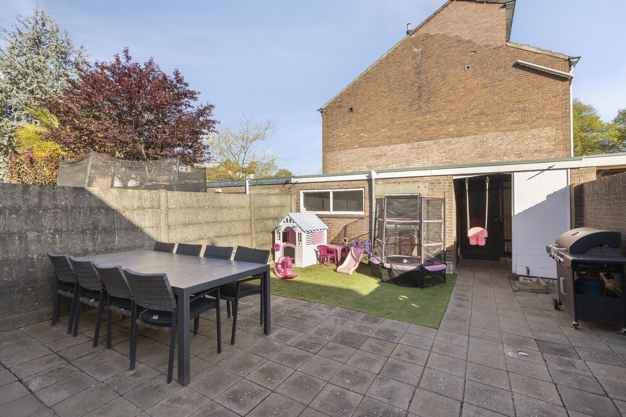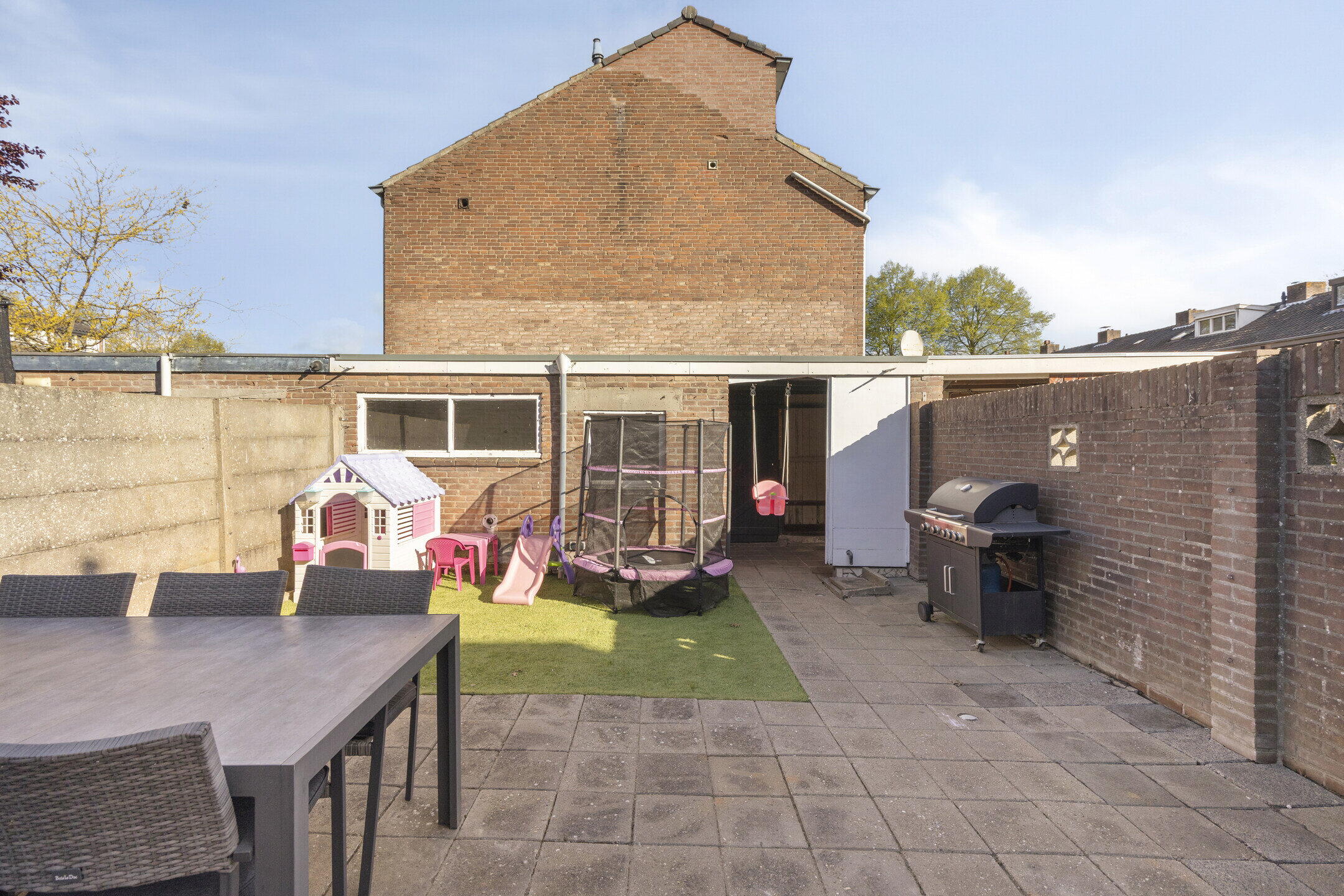 De achtertuin is netjes aangelegd met een combinatie van bestrating en groen. Hier creëer je eenvoudig een gezellige loungeplek of eethoek om te genieten van het buitenleven. Achterin de tuin vind je een praktische berging en een achterom—wel zo handig!